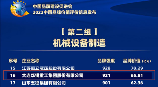 6月8日,遼寧省品牌建設(shè)促進會發(fā)布2022年度遼寧省品牌價值評價信息,評價結(jié)果顯示,大連重工裝備集團下屬大連華銳重工集團股份有限公司(簡稱“大連重工”)以94.74億元的品牌價值,居企業(yè)品牌價值榜第一位。