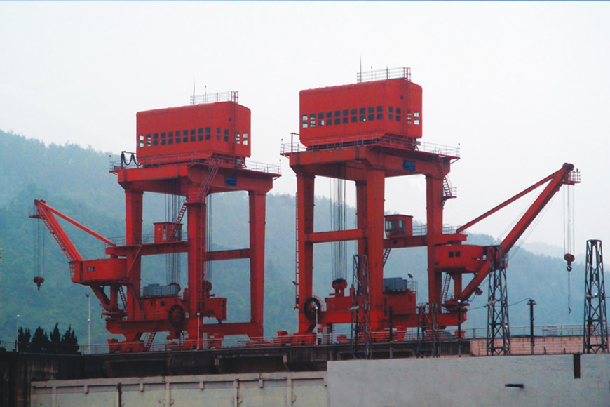 水電站門式起重機是一種門式多功能起重機,主要工作于水電站大壩壩頂或尾平臺,用于發(fā)電機組進水口工作門、排沙底口事故檢修門、攔污柵、泄洪水閘平板工作門等各類閘門的啟閉、搬運,用于機電設備安裝及壩頂其他設備的吊運等。大連重工研制的該類產品的主要技術特點:起重量大(最大1000t)、超載能力強、跨度較?。ǔ?0-20m)、起升高度大、配有自動化或智能化的水下液壓掛梁,可采用各種先進的電氣調速系統(tǒng)和PLC及網絡控制系統(tǒng)。